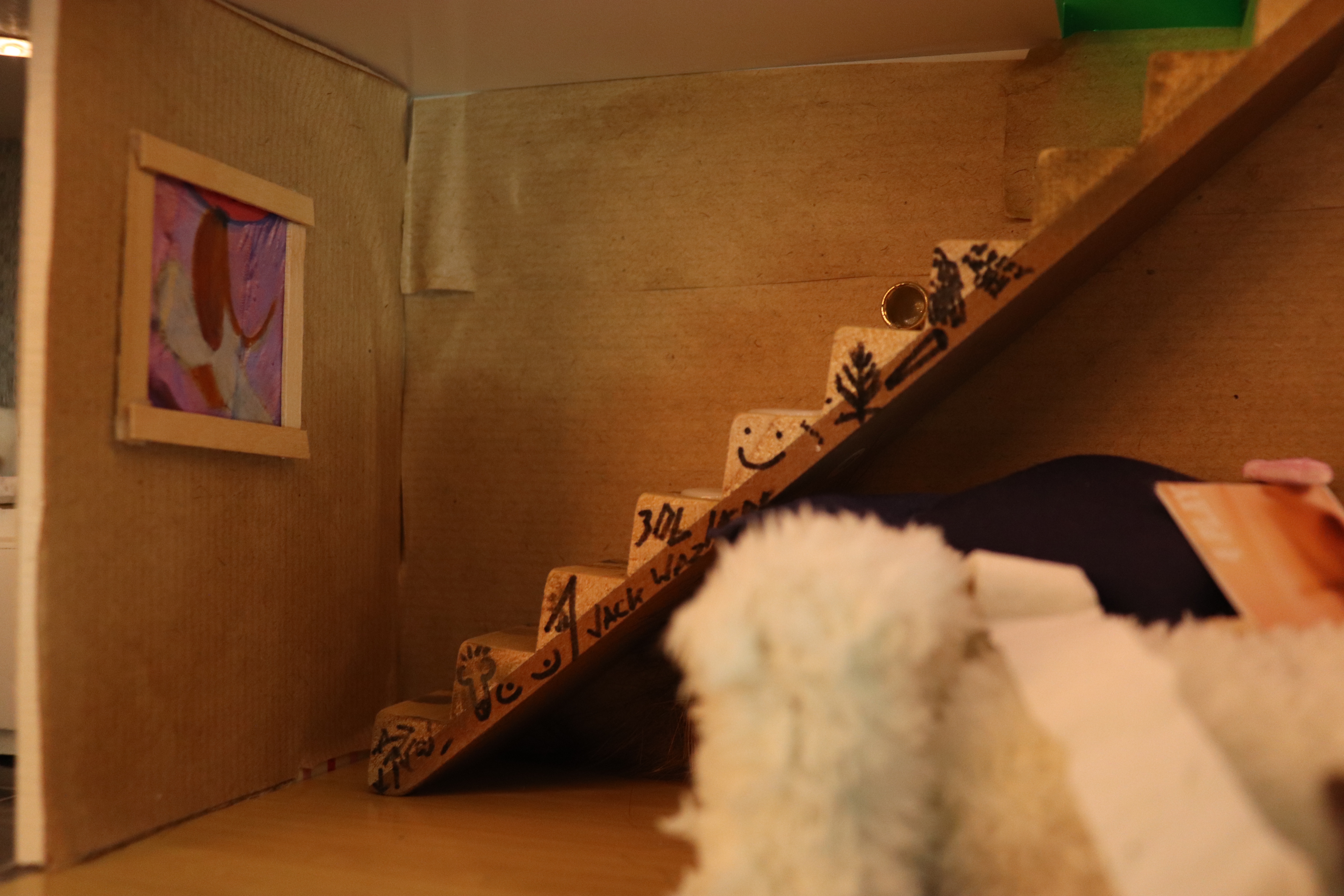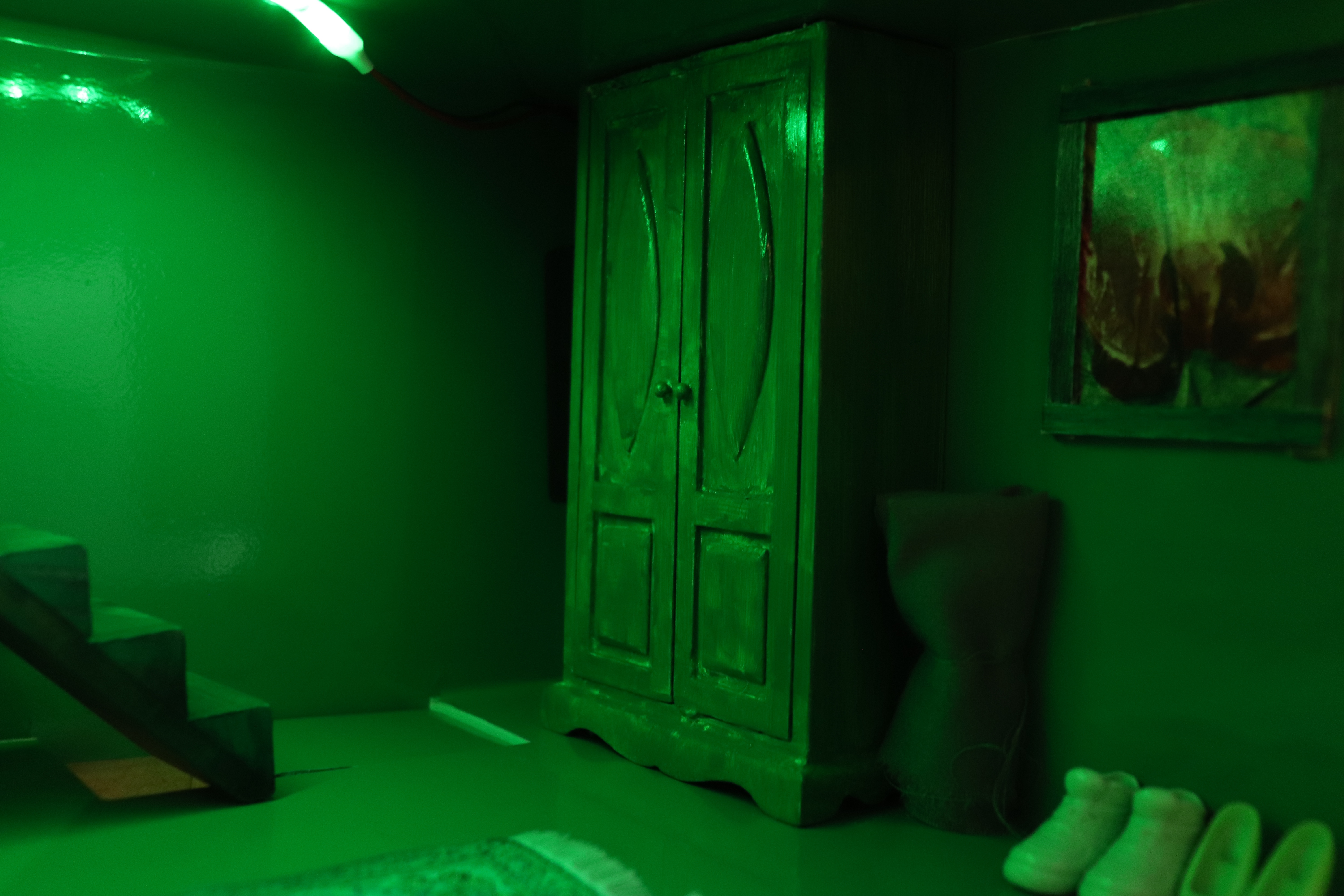 Venturing into the attic I was greeted by an overpowering smell of acrylic paint and turpentine as well as another scent of something that may have been decaying although it was impossible to tell due to the chemical scent in the air.