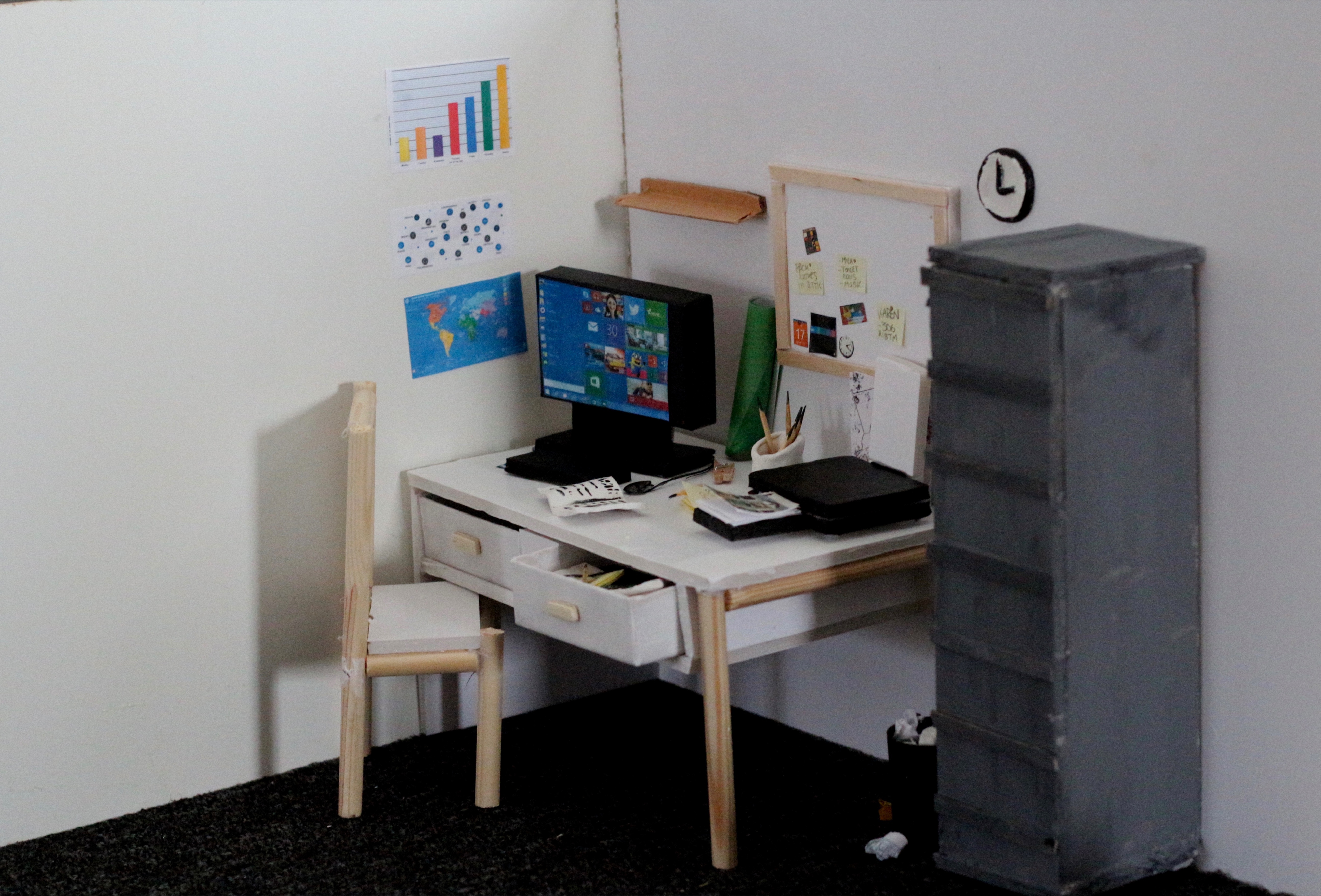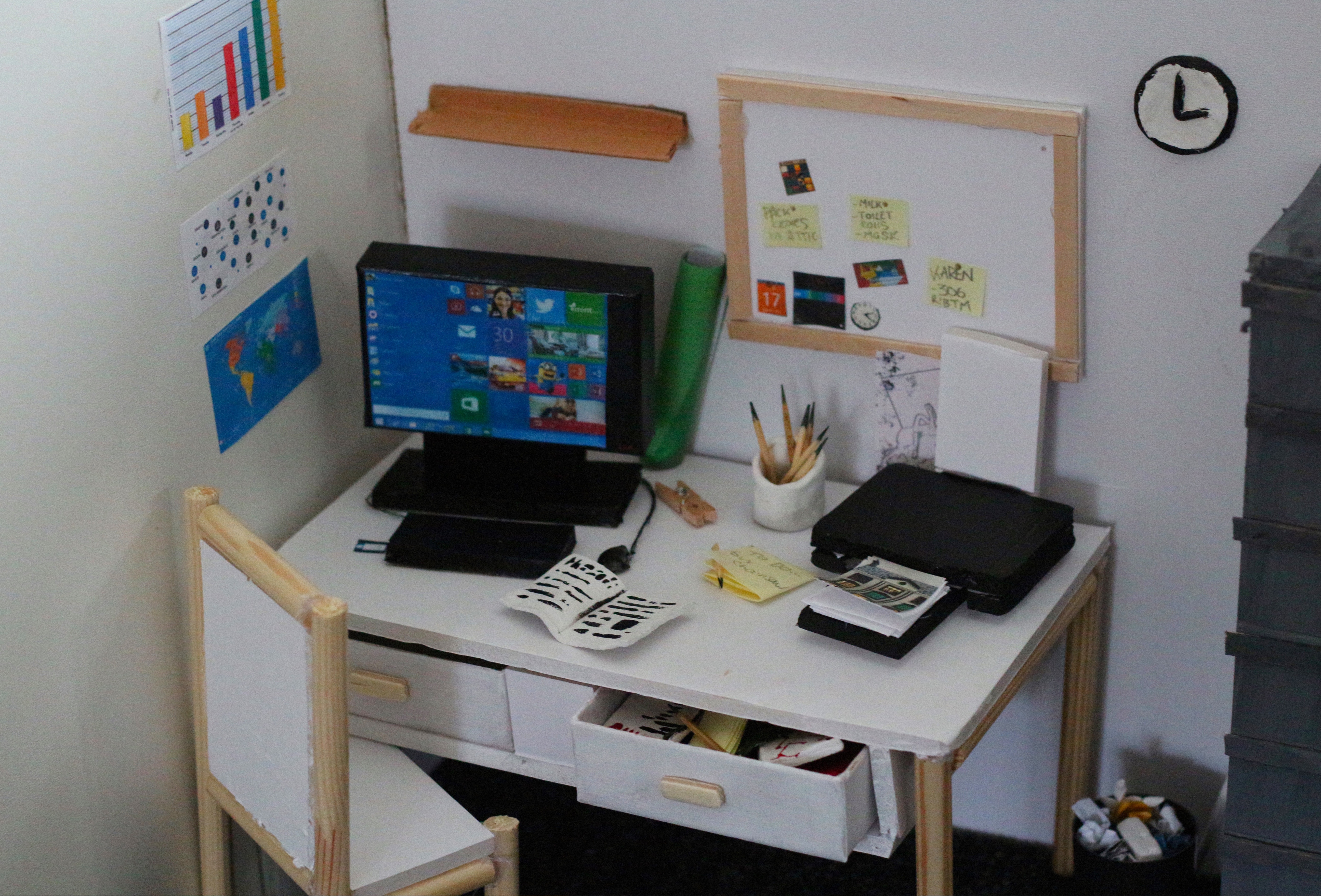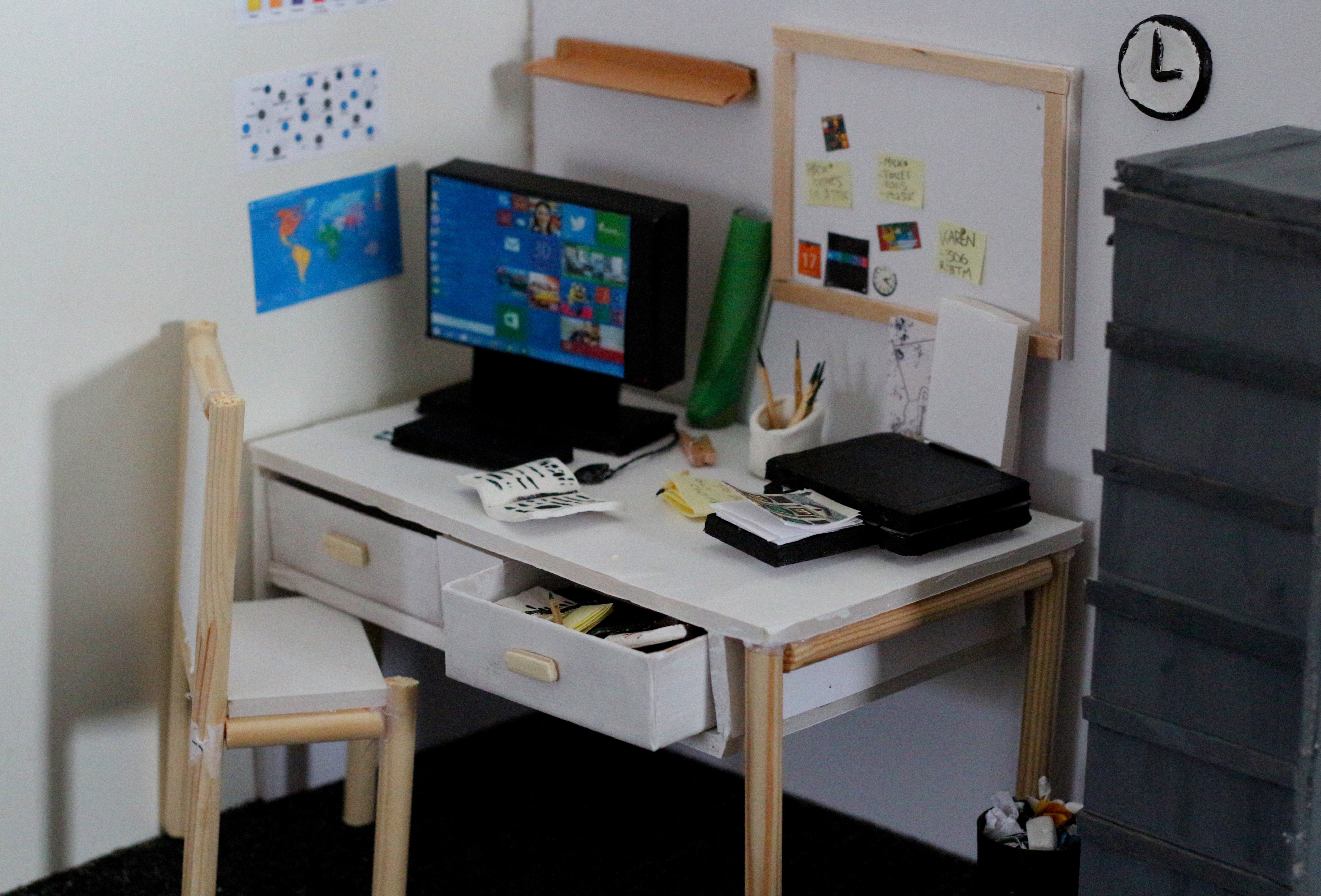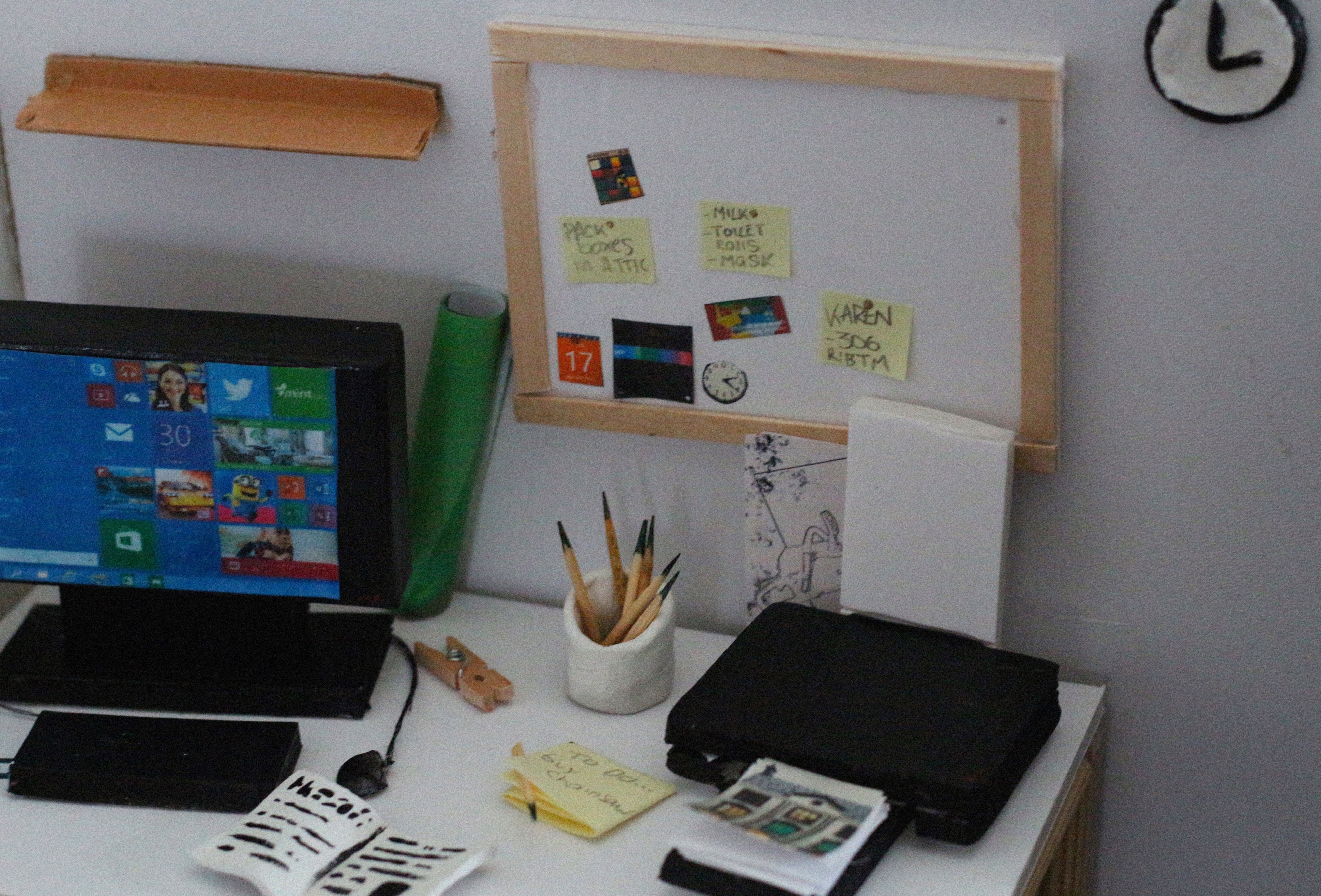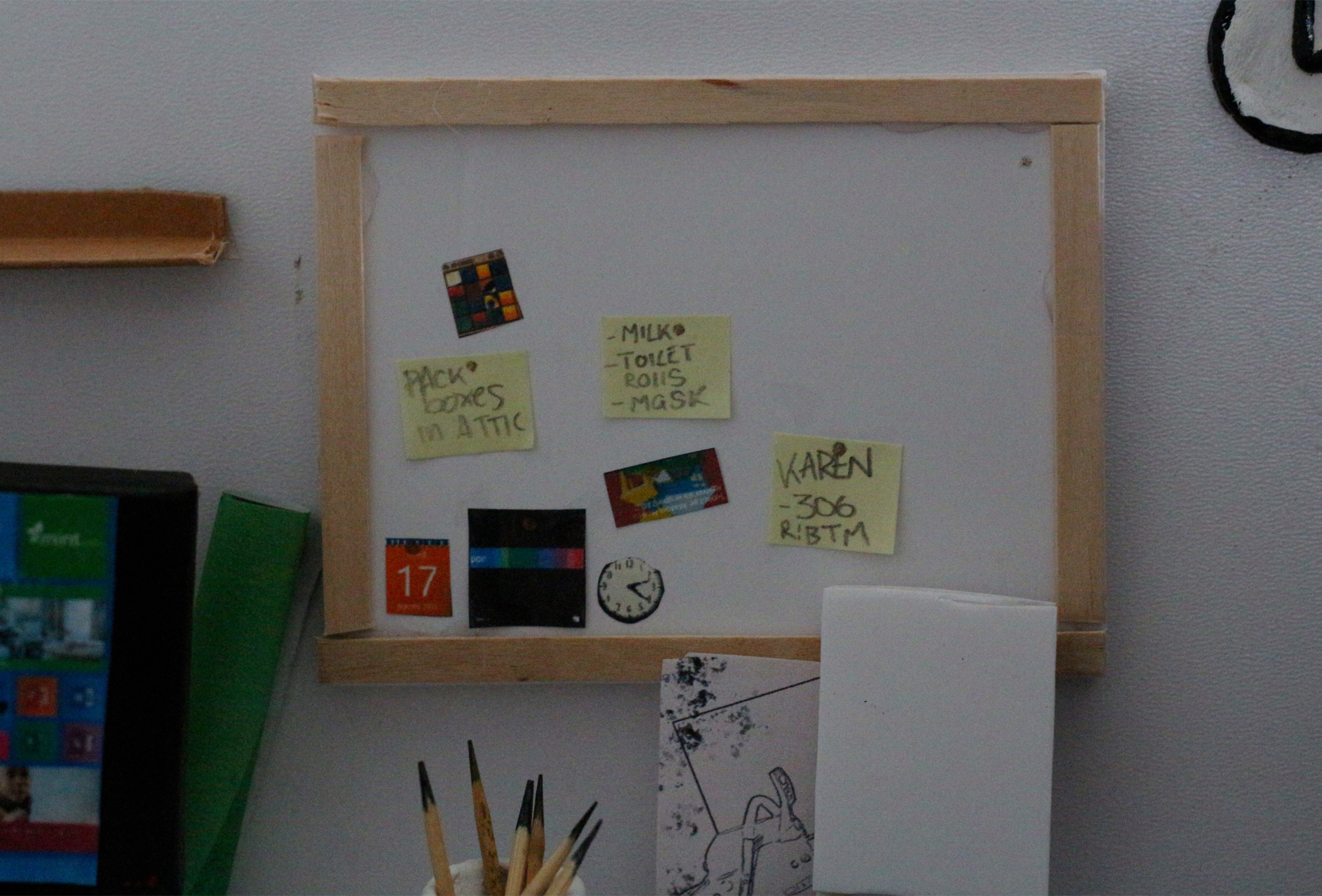 The only evidence there seemed to be of any sort of person inhabiting this workspace were some post it notes filled with reminders and a picture of what seems to be a home.