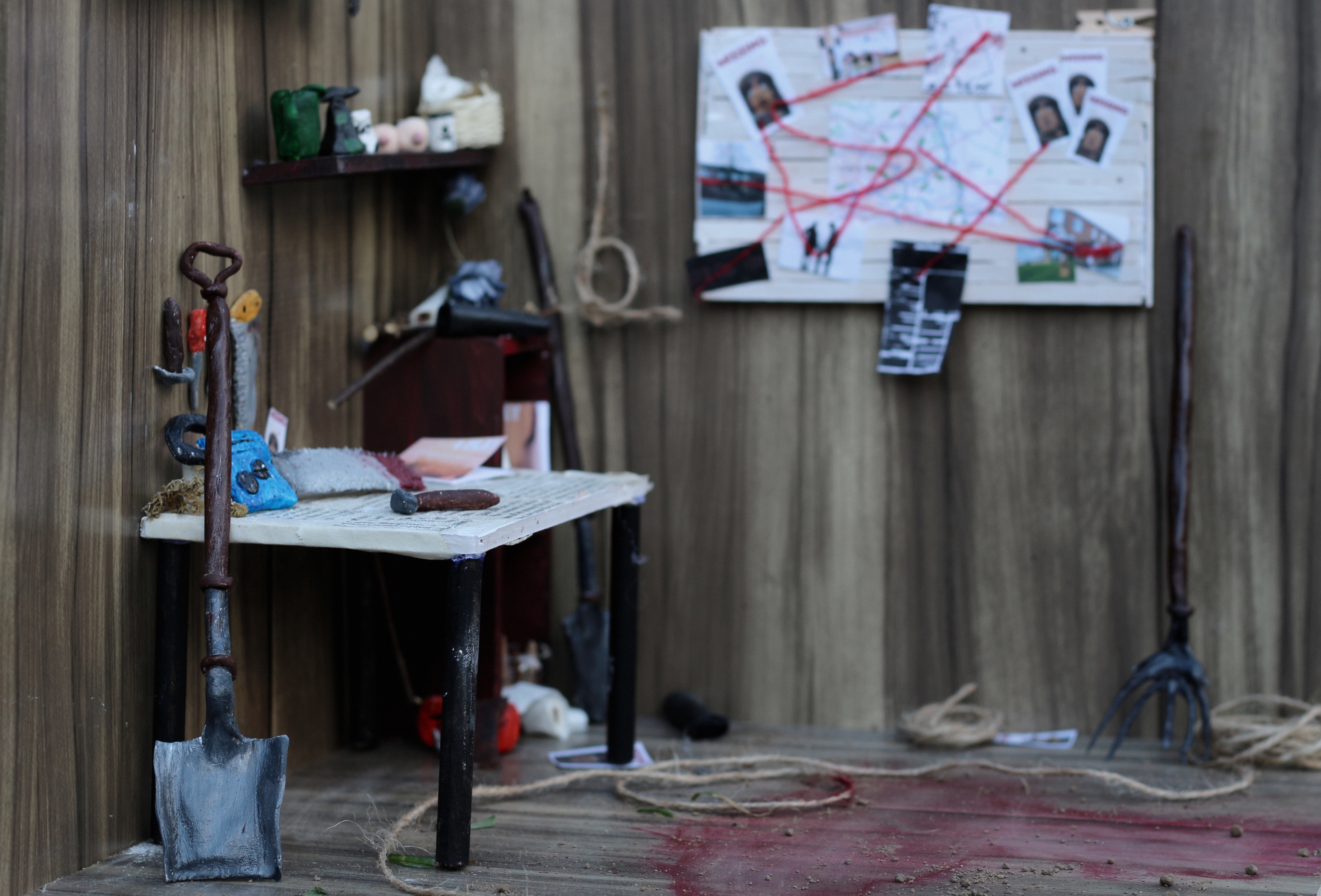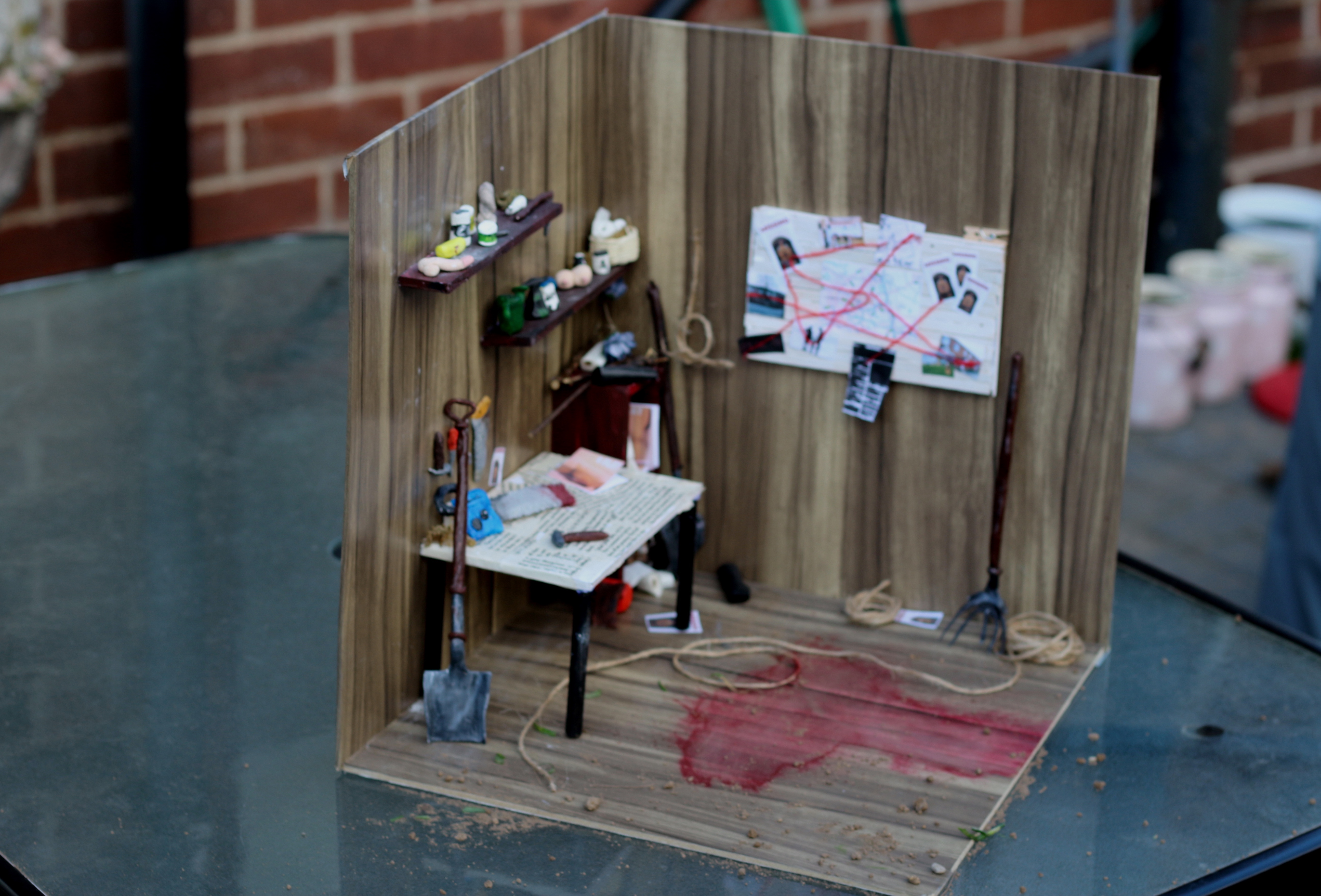 The ground was stained a dark crimson that matched the dried flecks of red that soiled the tools on the workbench. A map detailing missing people from the local area who would never be found again. The shelves adorned with trophies from his victims making this garden shed feel like this man’s monument to his inhumanity.