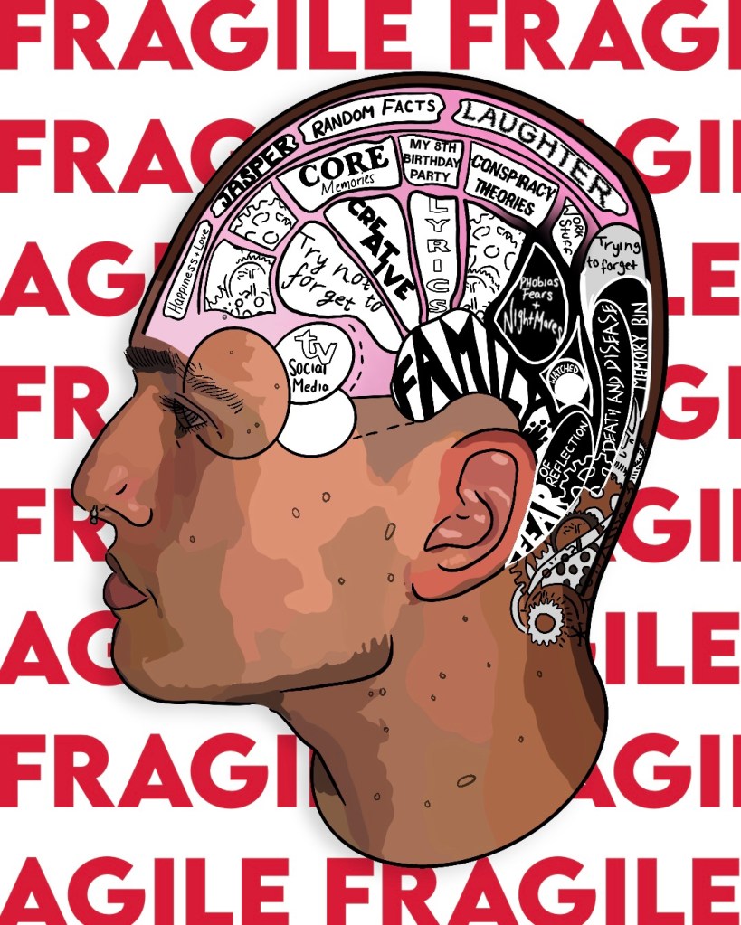 The video is all handmade of different materials I think best represent my mind within a box covered in Fragile tape. I originally wanted to create an immersive space but at the moment we are all feeling boxed in and wanting to get out, similar to overthinking during the lockdown. The Fragile tape represents the play of the fragility and agility of the brain itself.