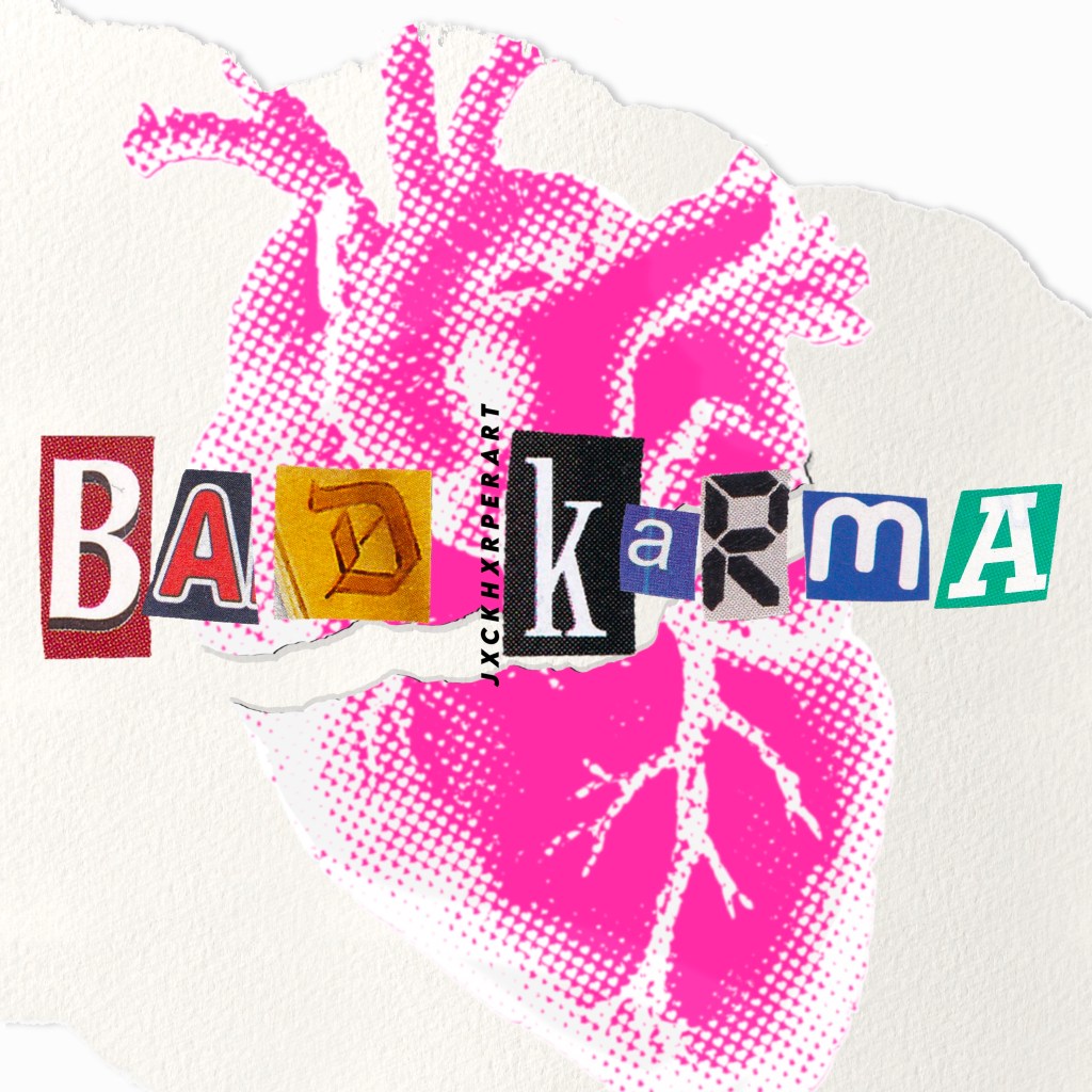 The lyrics “They say it’s bad karma being such a heartbreaker” from the chorus kept playing over and over in my head. The idea of a ripped paper heart to show the heartbreak and the play of the album title with the BAD KARMA written in magazine cut-outs over it, came into my head. Straight away I had to put together the piece before the idea goes away and I ended up with this BAD KARMA digital artwork!